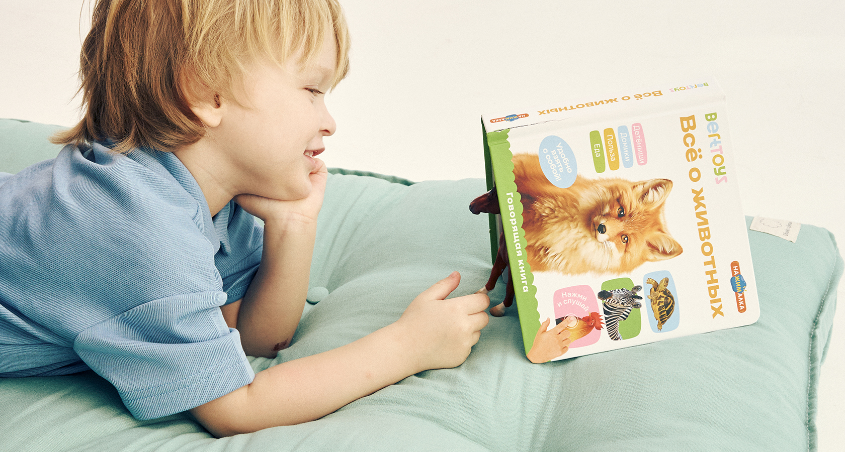 Совместно с педагогами мы создали первую энциклопедию малыша, которая познакомит кроху с окружающим миром. Ребенок нажимает пальчиком на реалистичные картинки и книга озвучивает их.